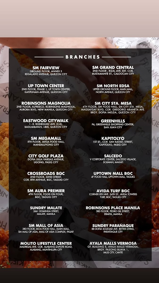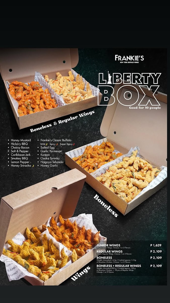 Welcome to Frankie's New York Buffalo Wings - Ayala Malls Vermosa, a must-visit destination for wing lovers in Cavite! Located conveniently at the Ground Floor of Ayala Malls Vermosa, this vibrant eatery captivates with a diverse menu centered on flavorful wings. The buzz among diners highlights their exceptional offerings, including fan favorites like Salted Egg, Garlic Parmesan, Honey Garlic, and Lemon Pepper wings, all served piping hot and perfectly crispy.